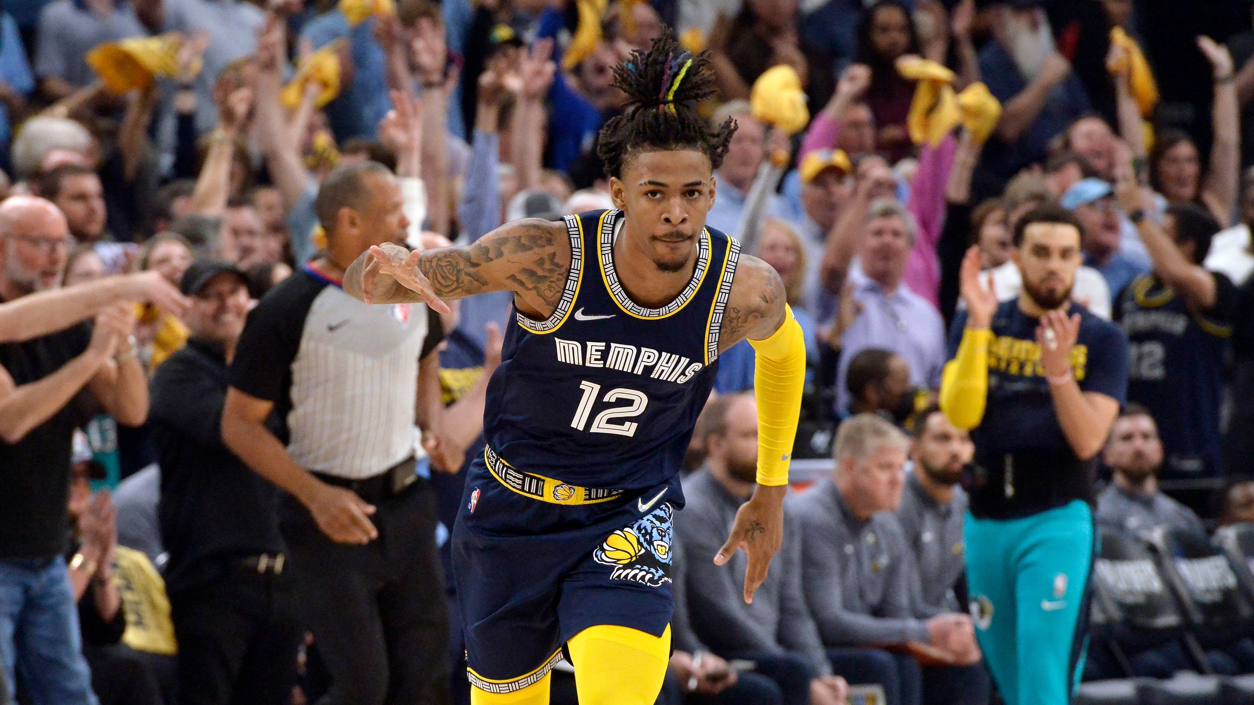 El jugador de los Grizzlies de Memphis Ja Morant (12) reacciona durante la primera mitad del segundo juego de su serie de semifinales contra los Warriors de Golden State, el martes 3 de mayo de 2022 en Memphis, Tennessee (AP Foto/Brandon Dill) (Brandon Dill/AP)