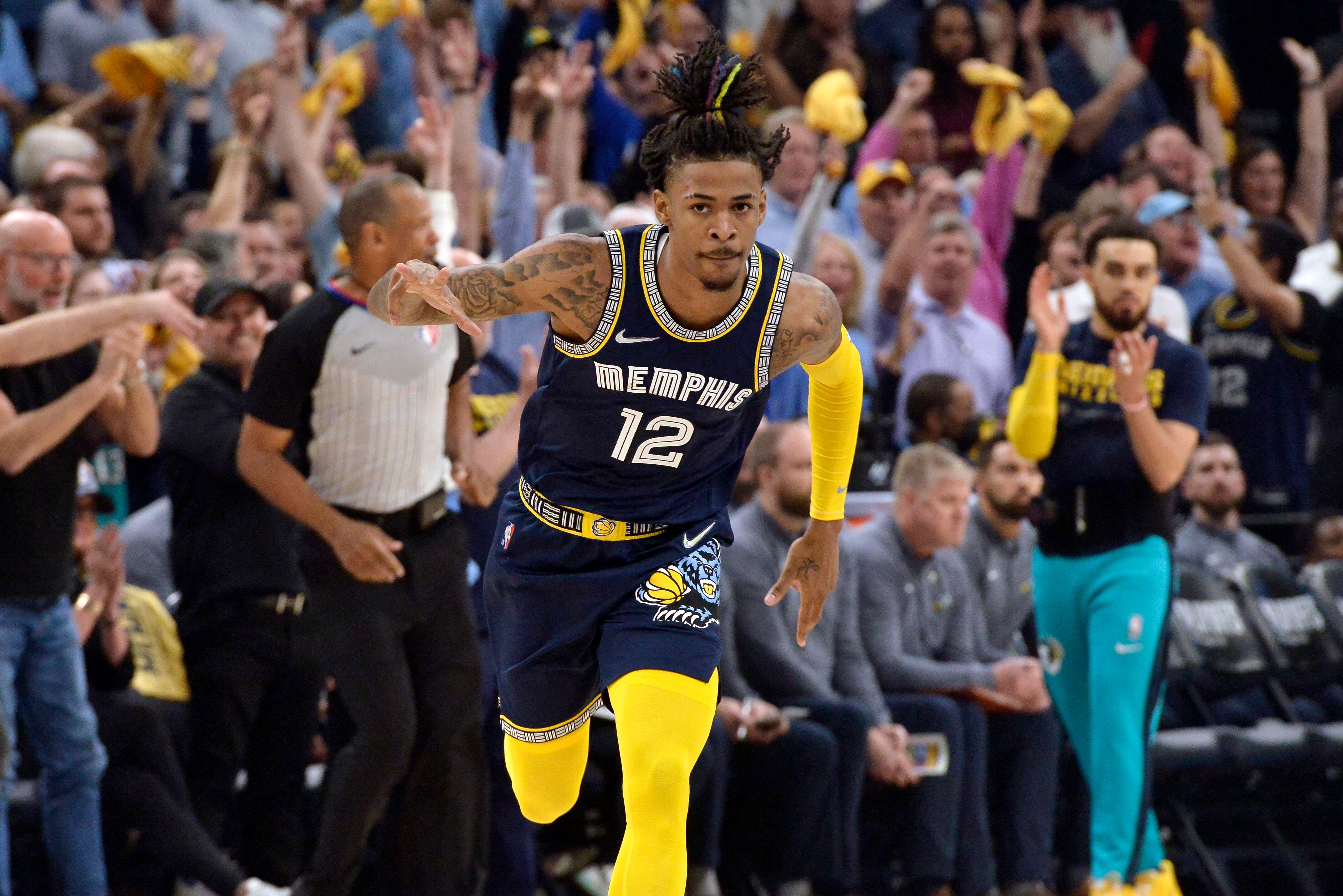 El jugador de los Grizzlies de Memphis Ja Morant (12) reacciona durante la primera mitad del segundo juego de su serie de semifinales contra los Warriors de Golden State, el martes 3 de mayo de 2022 en Memphis, Tennessee (AP Foto/Brandon Dill) (Brandon Dill/AP)