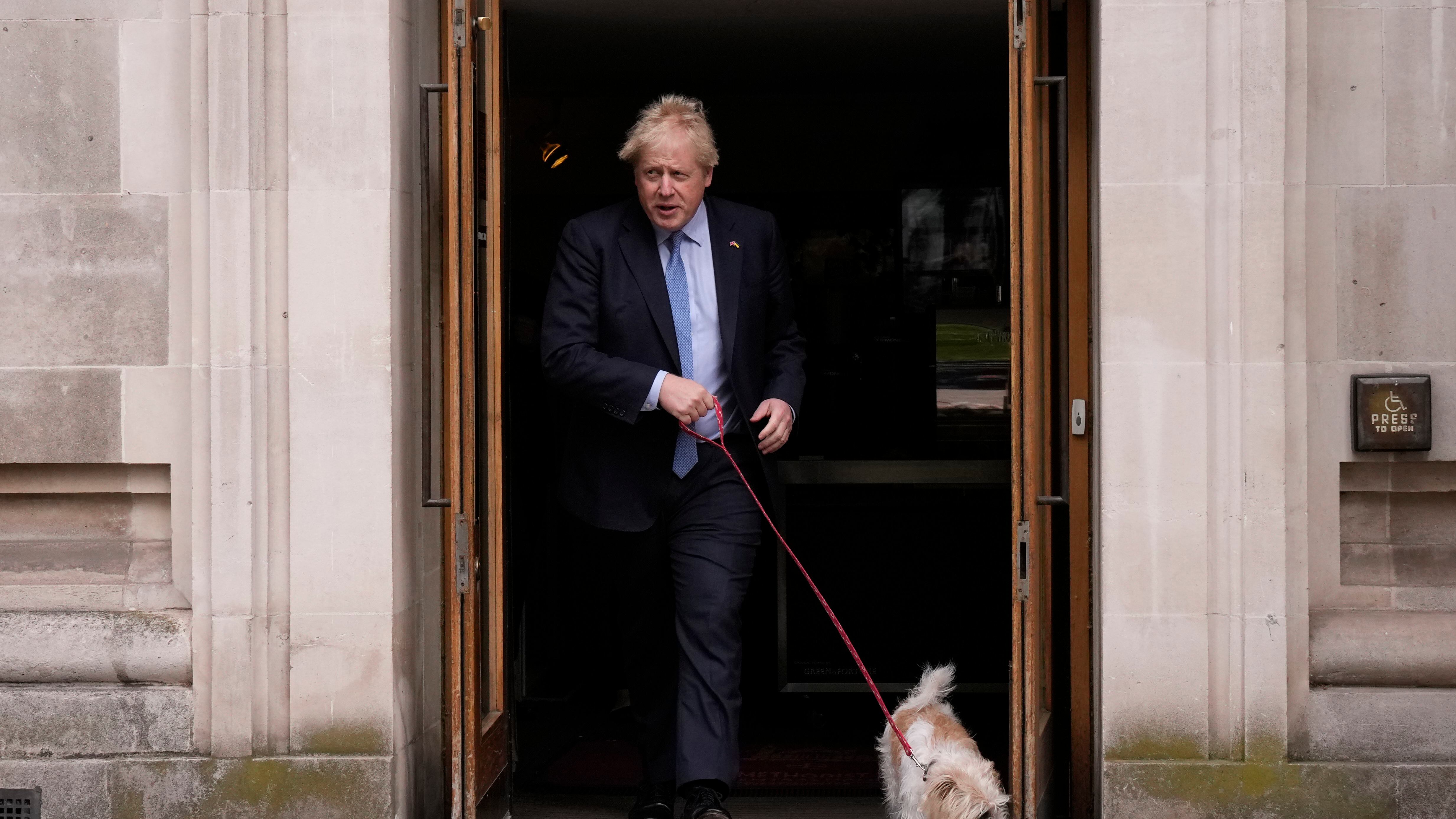 El primer ministro de Gran Bretaña, Boris Johnson, abandona un centro electoral acompañado por su perro Dilyn, en el centro de Londres, luego de votar en comicios locales, el 5 de mayo de 2022. (AP Foto/Matt Dunham) (Matt Dunham/AP)