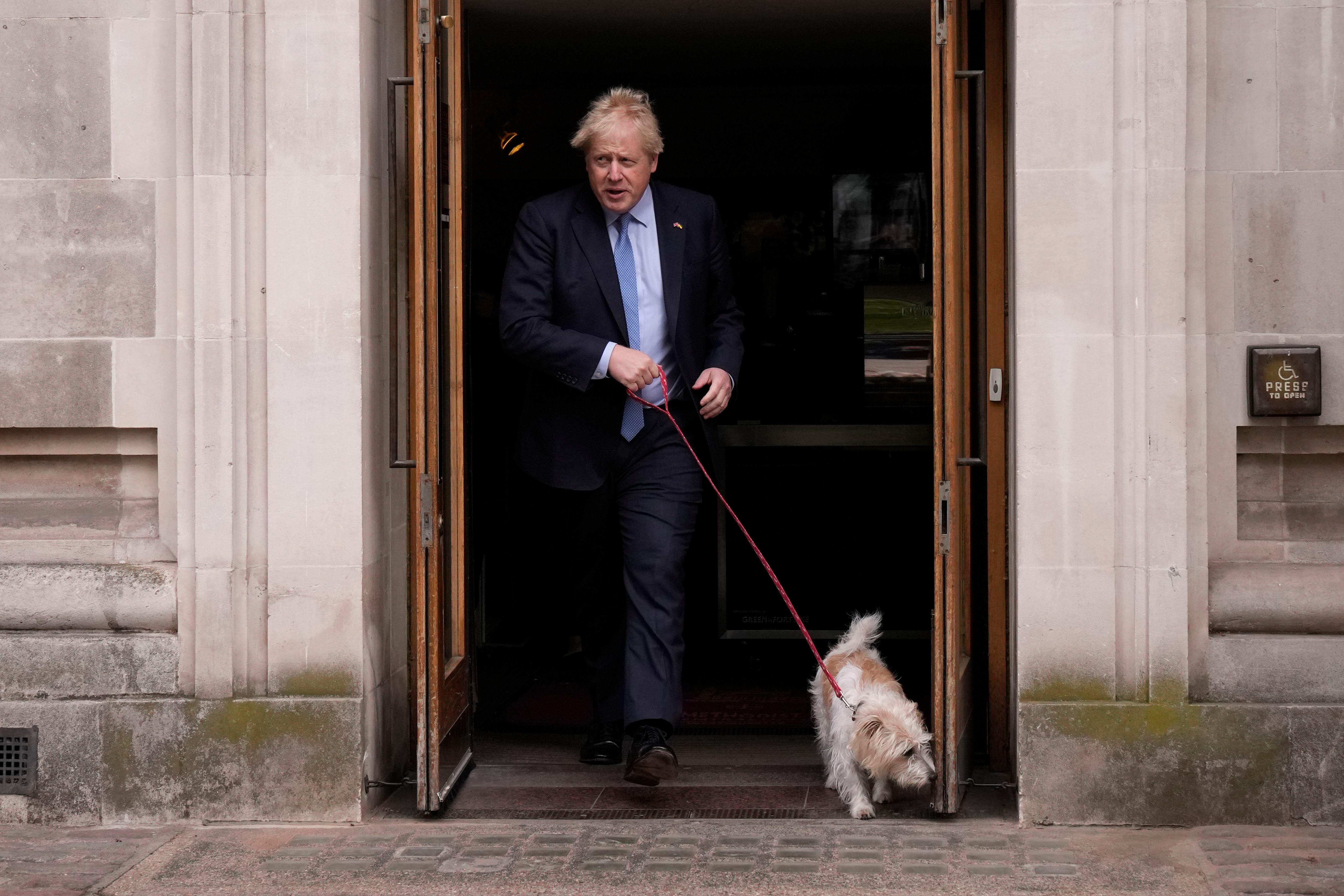El primer ministro de Gran Bretaña, Boris Johnson, abandona un centro electoral acompañado por su perro Dilyn, en el centro de Londres, luego de votar en comicios locales, el 5 de mayo de 2022. (AP Foto/Matt Dunham) (Matt Dunham/AP)