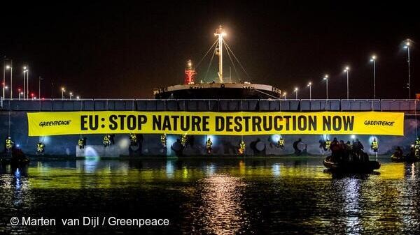 Greenpeace bloquea un ‘megabuque’ de soja en el puerto de Amsterdam para denunciar la deforestación del Amazonas