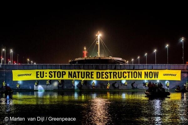 Asimismo, los líderes indígenas se unen a la protesta desde el Beluga II, el velero de Greenpeace de 33 metros de eslora, con una pancarta entre los mástiles en la que se lee ‘UE: Detengan la destrucción de la naturaleza ya’.