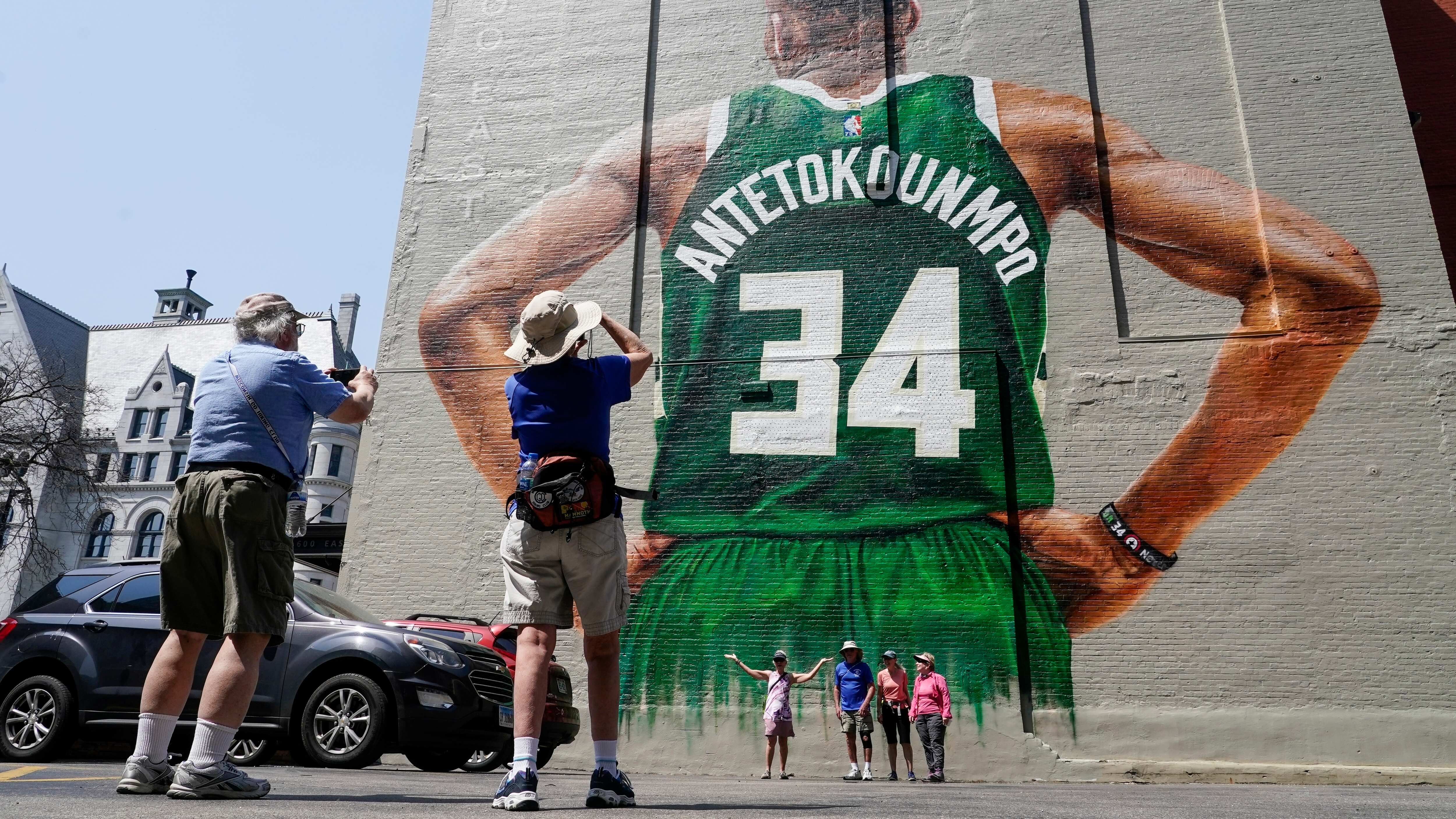 El autor del mural, Mauricio Ramírez, firmó su obra el viernes, varias horas antes de que Antetokounmpo y los Bucks enfrentaran a los Celtics de Boston en el sexto partido de la semifinal de la Conferencia Este.