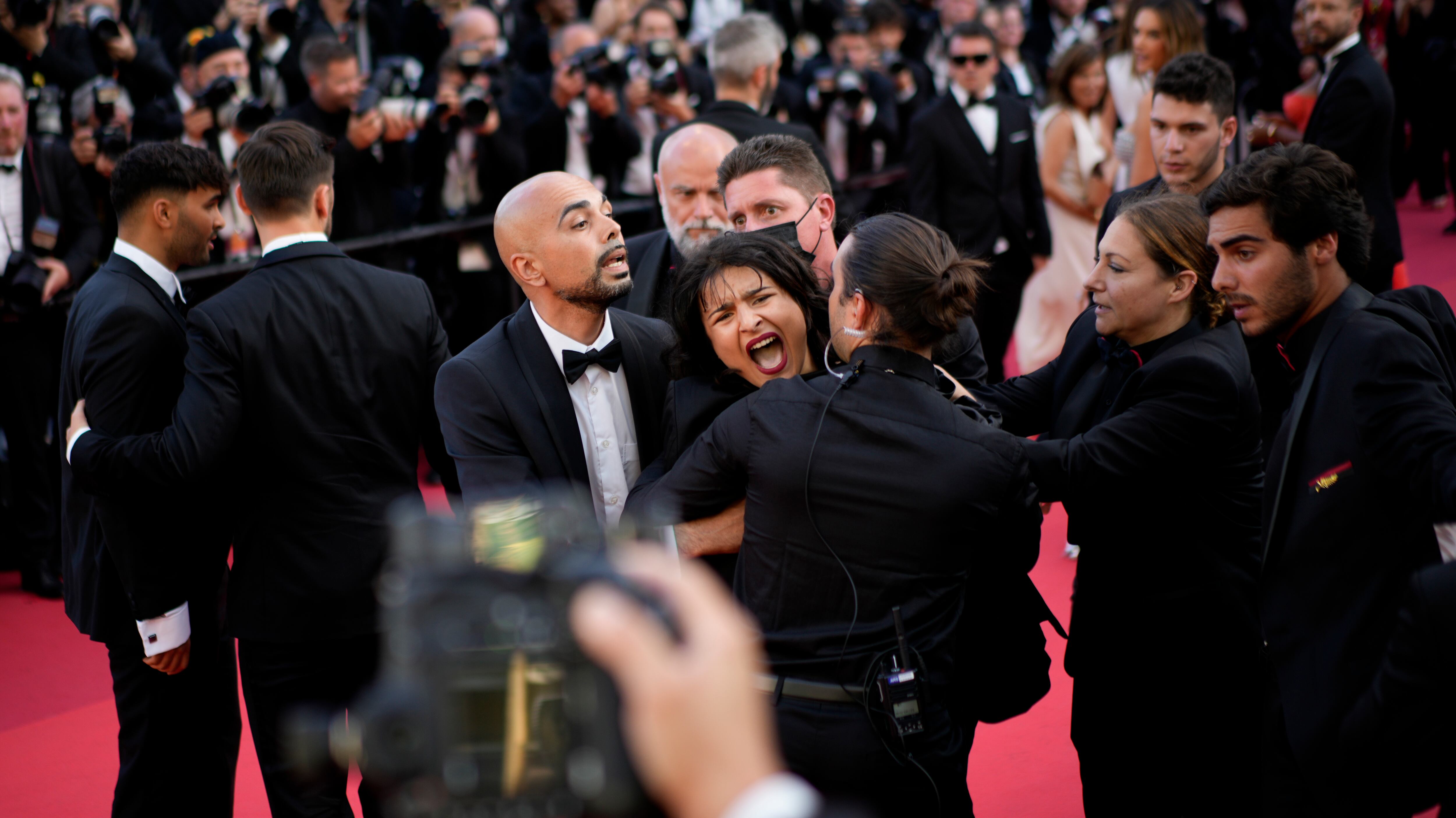 Mientras gritaba "¡No nos violen!”, personal de seguridad rápidamente la rodeó y la sacó de la alfombra.