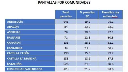En España, existen aproximadamente 77 salas de cine por cada millón de habitantes, dos más que en la anterior entrega del censo, aunque 5 inferior a la cifra de hace diez años. Las comunidades que tienen 80 o más salas por millón de habitantes son: La Rioja (138), Navarra (94), País Vasco (89), Comunidad Valenciana (84), Cataluña (81) y Murcia (80). En cuanto a las provincias con mayor densidad de salas son, por este orden, Soria, La Rioja, Segovia, Tarragona, Girona, Salamanca y Cádiz, que superan las 100 salas por millón de habitantes.