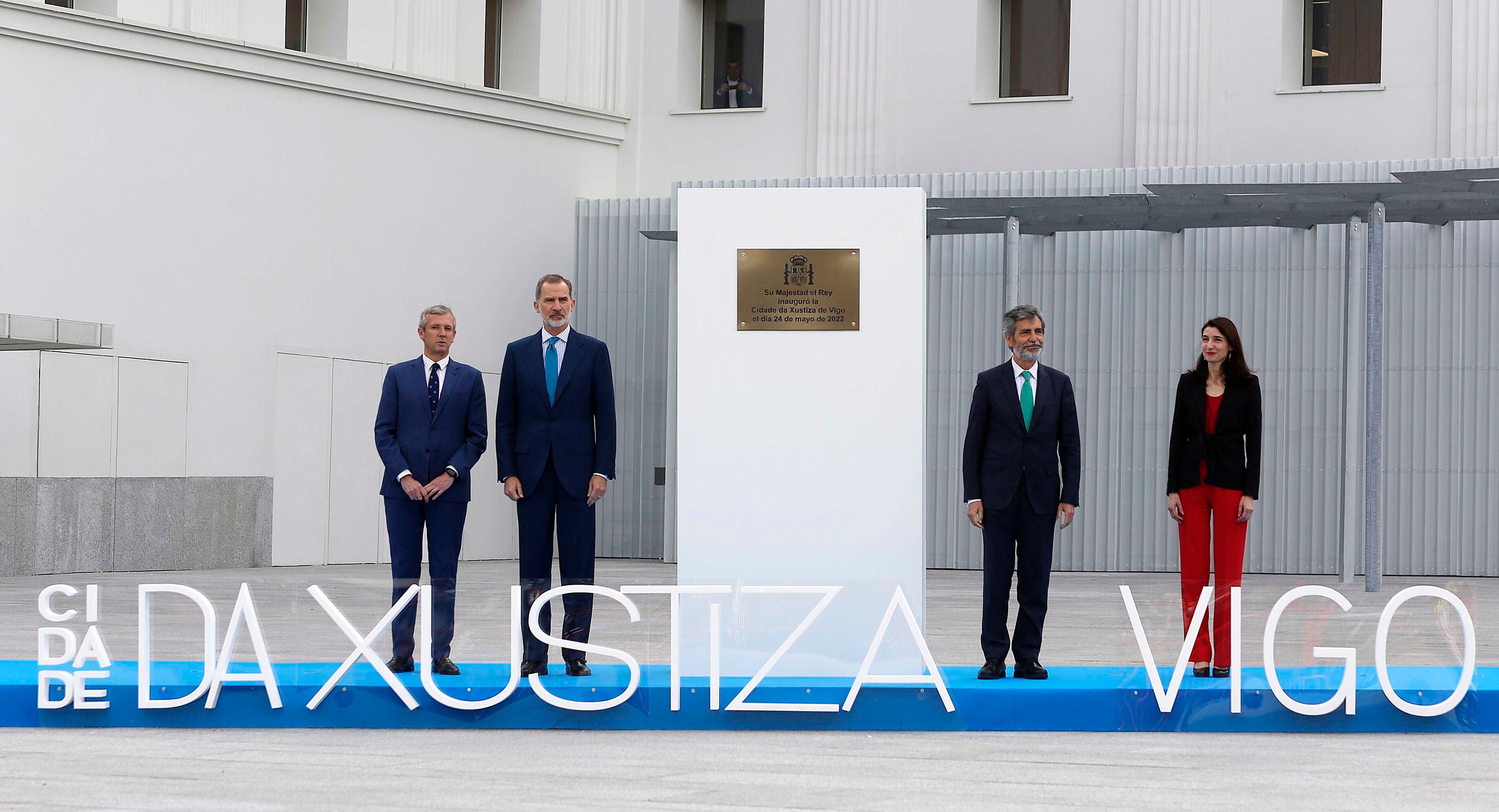 El rey Felipe VI, junto al presidente de la Xunta, Alfonso Rueda; el presidente del CGPJ, Carlos Lesmes; y la ministra de Justicia, Pilar Llop, junto a la placa conmemorativa con motivo de la inauguración de la Ciudad de la Justicia de Vigo. JAVIER VÁZQUEZ-EUROPA PRESS (JAVIER VÁZQUEZ-EUROPA PRESS/Europa Press)
