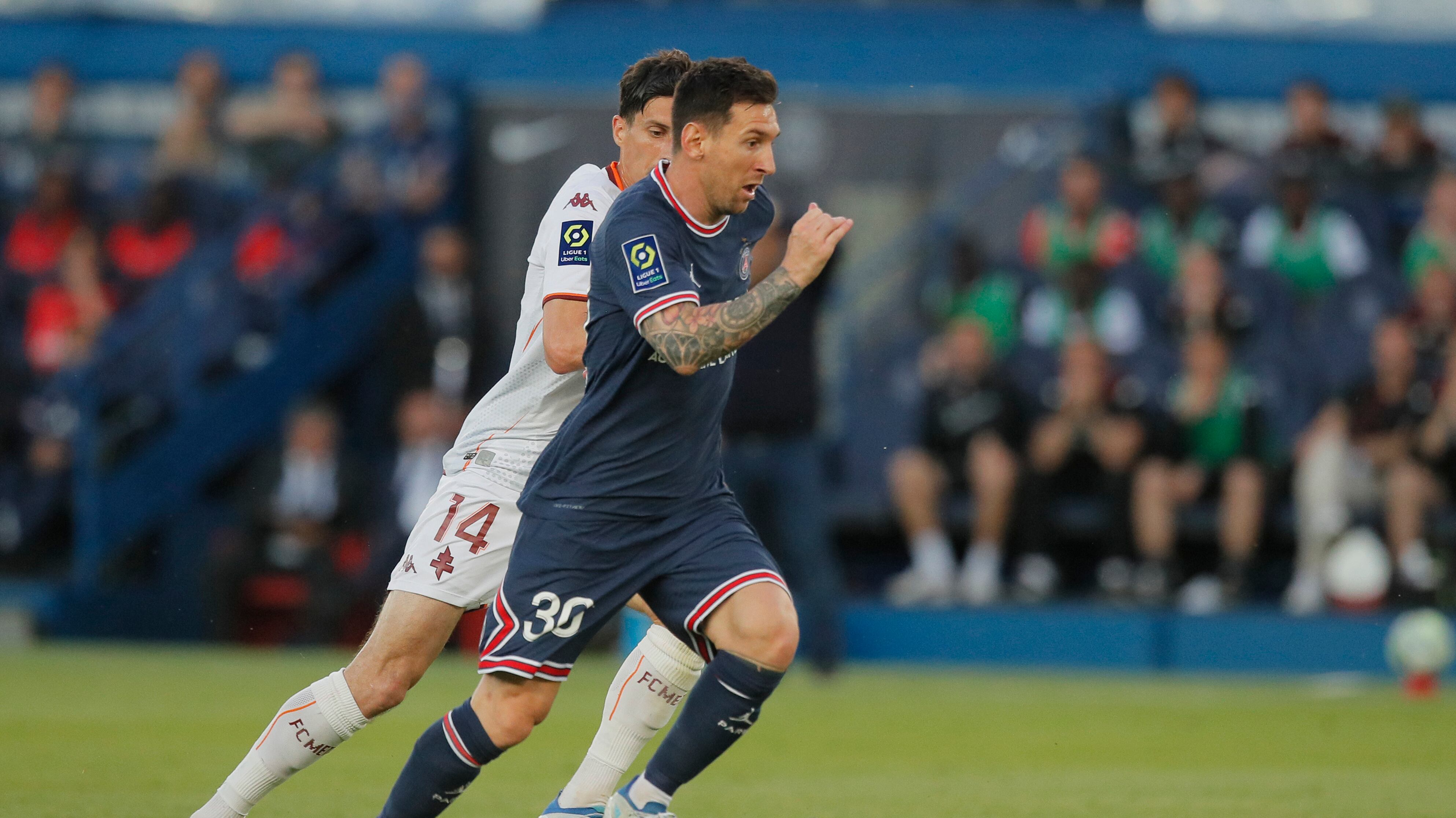 El delantero argentino Lionel Messi, del PSG, avanza con el balón en duelo ante el Metz en la liga francesa, en el Parc des Princes de París, Francia, el sábado 21 de mayo de 2022. (AP Foto/Michel Spingler) AP (Michel Spingler/AP)