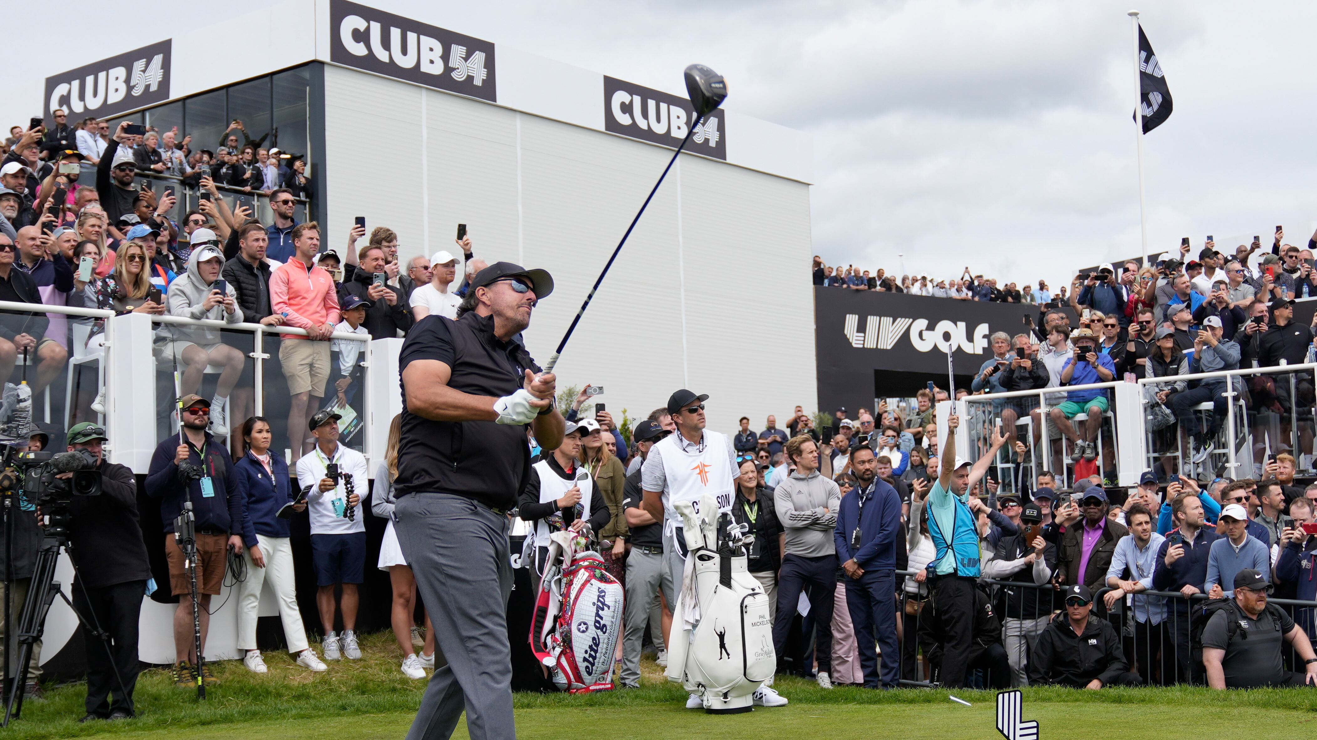 Mickelson en el primer tee durante la primera ronda de la primera edición del LIV Golf Invitational (Alastair Grant/AP)