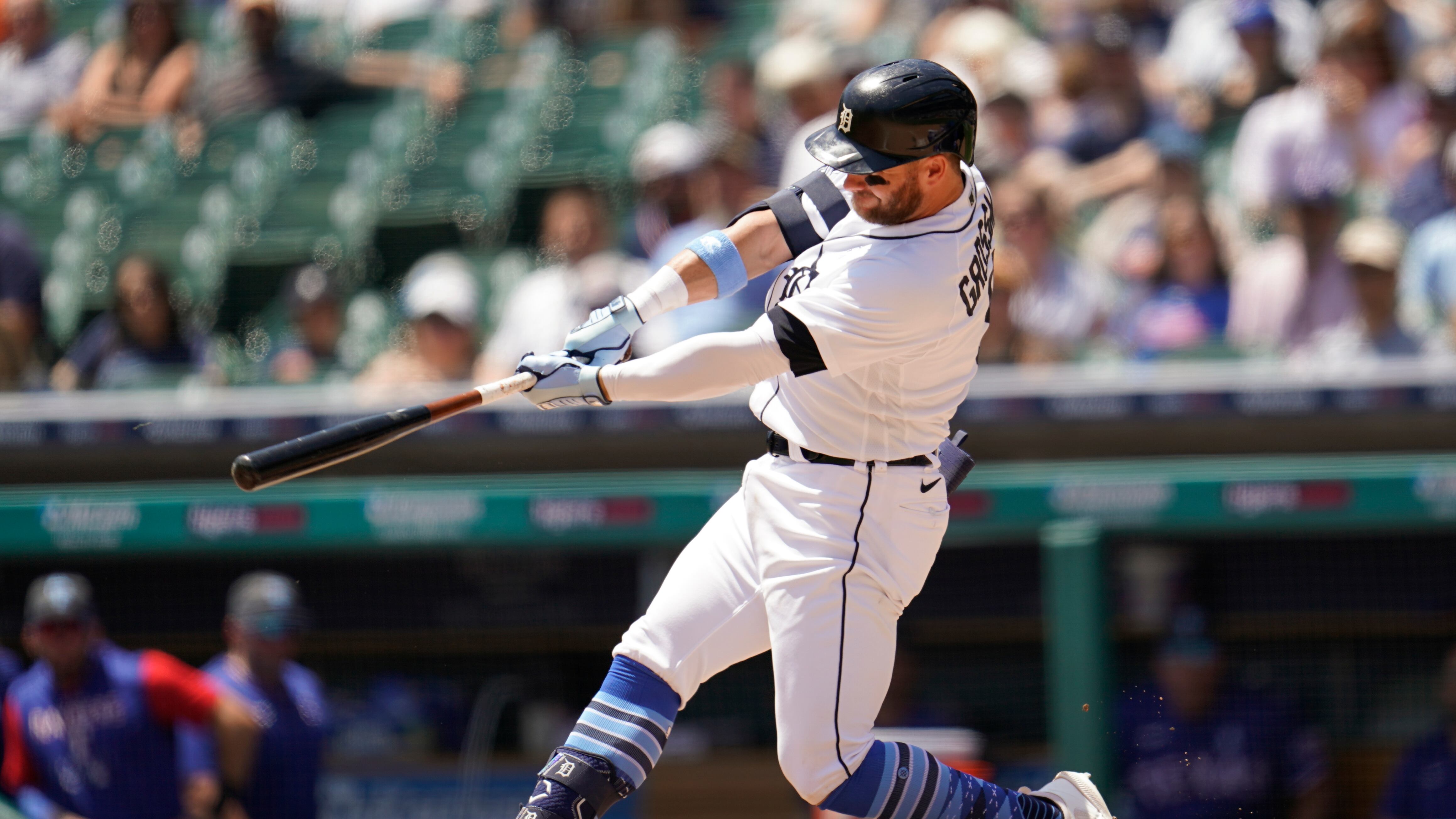 DETROIT (AP) — Robbie Grossman conectó un bambinazo y remolcó cuatro carreras en la victoria de los Tigres de Detroit el domingo de 7-3 sobre los Rangers de Texas para dividir la serie de cuatro partidos.