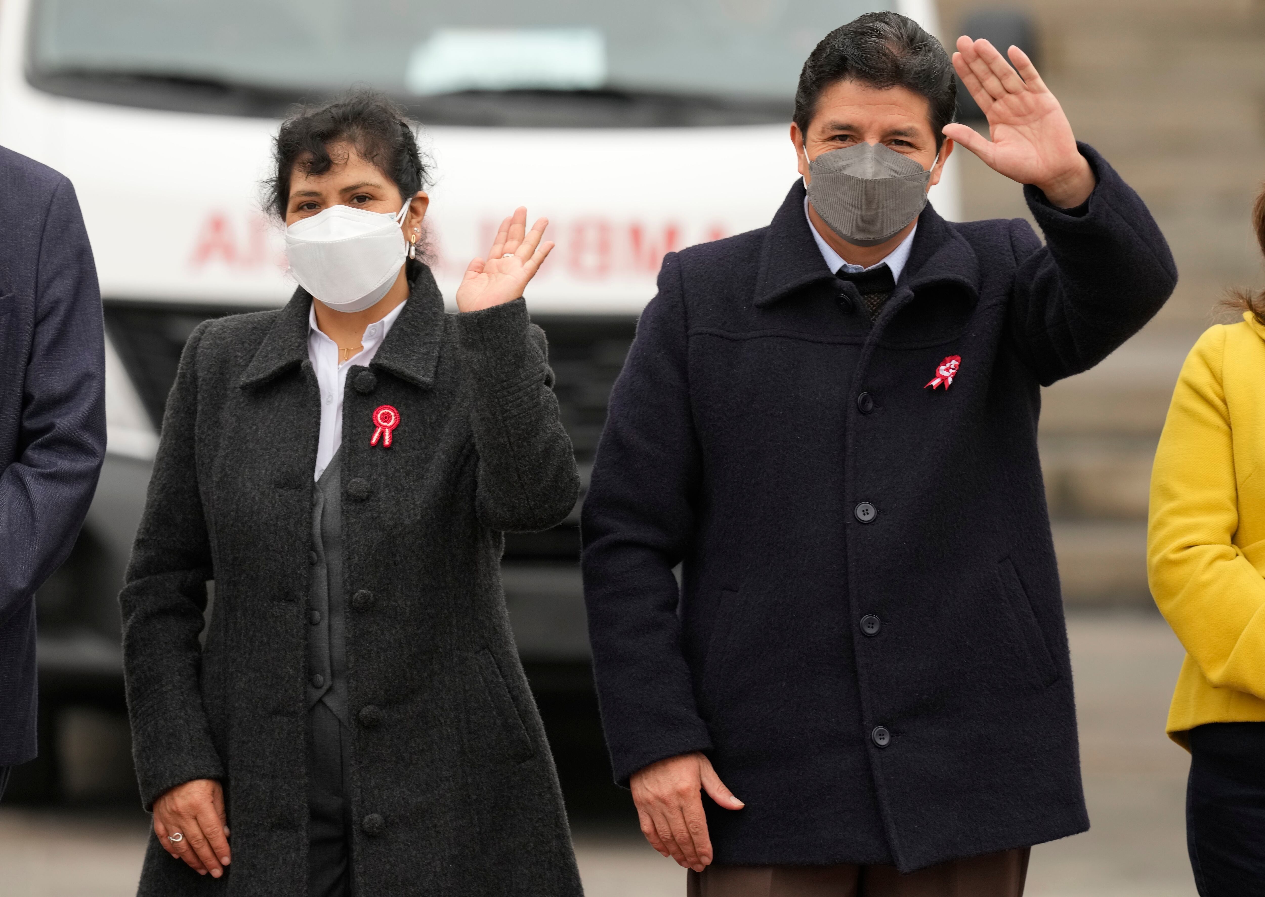 El presidente de Perú, Pedro Castillo, y su esposa, Lilia Paredes, saludan durante una ceremonia para recibir ambulancias donadas por Japón en el palacio de gobierno en Lima, Perú, el jueves 21 de julio de 2022. (Foto AP/Martín Mejía) AP (Martin Mejia /AP)