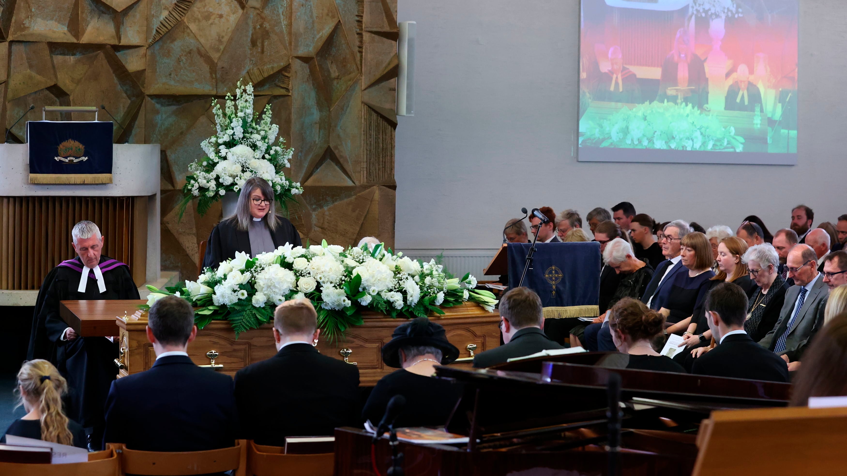 El presidente irlandés Michael D. Higgins, altos funcionarios británicos y políticos de ambos lados de la división católico-protestante de Irlanda del Norte también asistieron al funeral, incluyendo el otrora enemigo de Trimble, el exlíder del Sinn Fein, Gerry Adams.