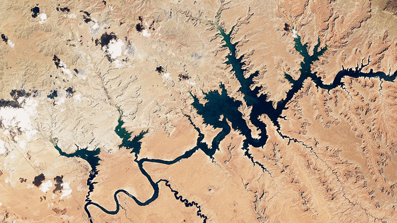 Se tomó en cuenta las imágenes del 6 de agosto debido a que fue de 3.633,04 pies de elevación del agua en el lagomedido, en la presa Glen Canyon. En relación con la década pasada, 98 pies menos.