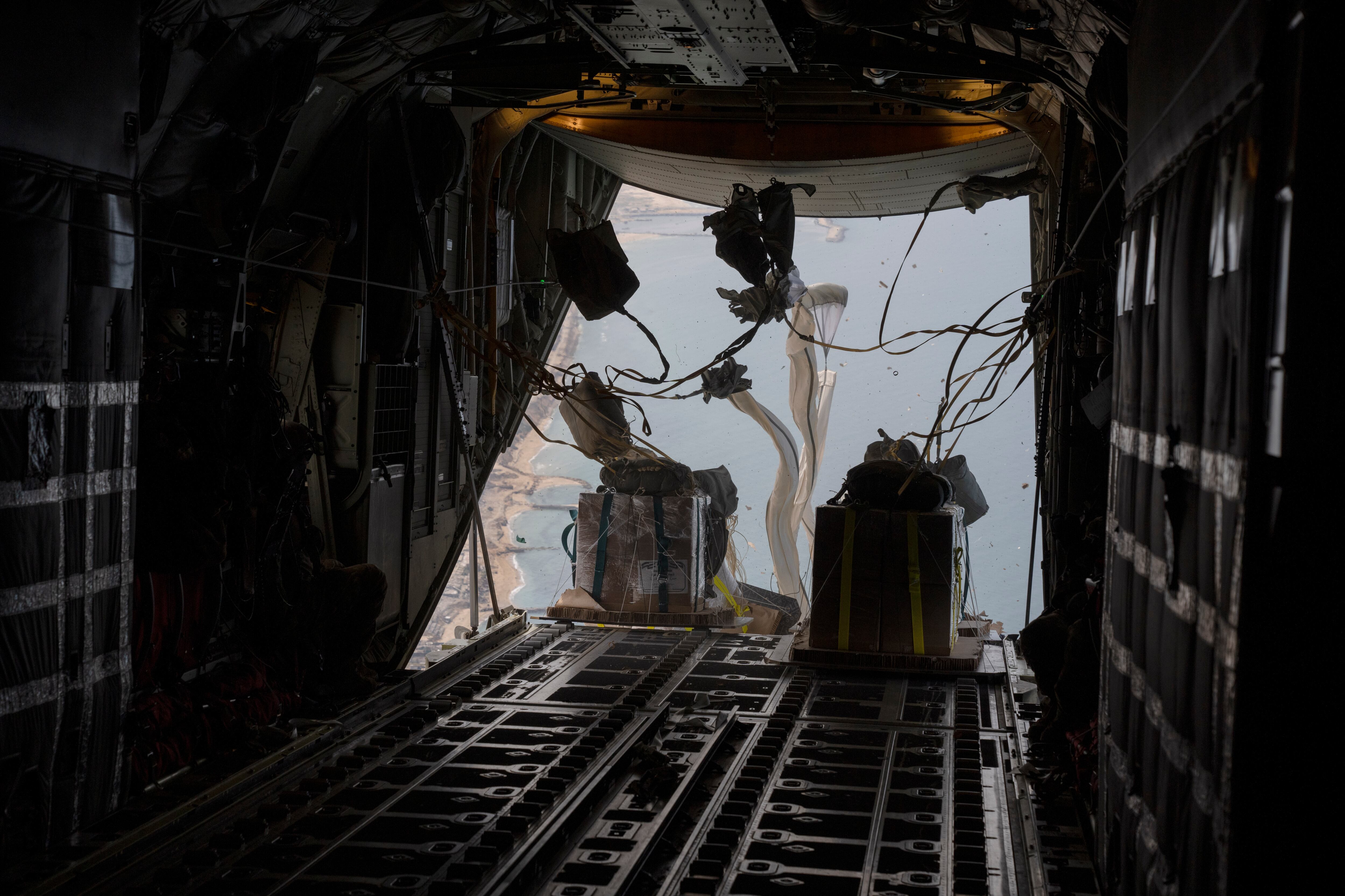 Observaban mientras tres toneladas de apoyo humanitario — comida, agua y productos de higiene suministrados por Jordania — salían de la parte trasera del avión de transporte C-130, con un enredo de paracaídas volando por atrás. Fue la 11a entrega de suministros por paracaídas estadounidense desde que Estados Unidos comenzó el programa a principios de marzo.