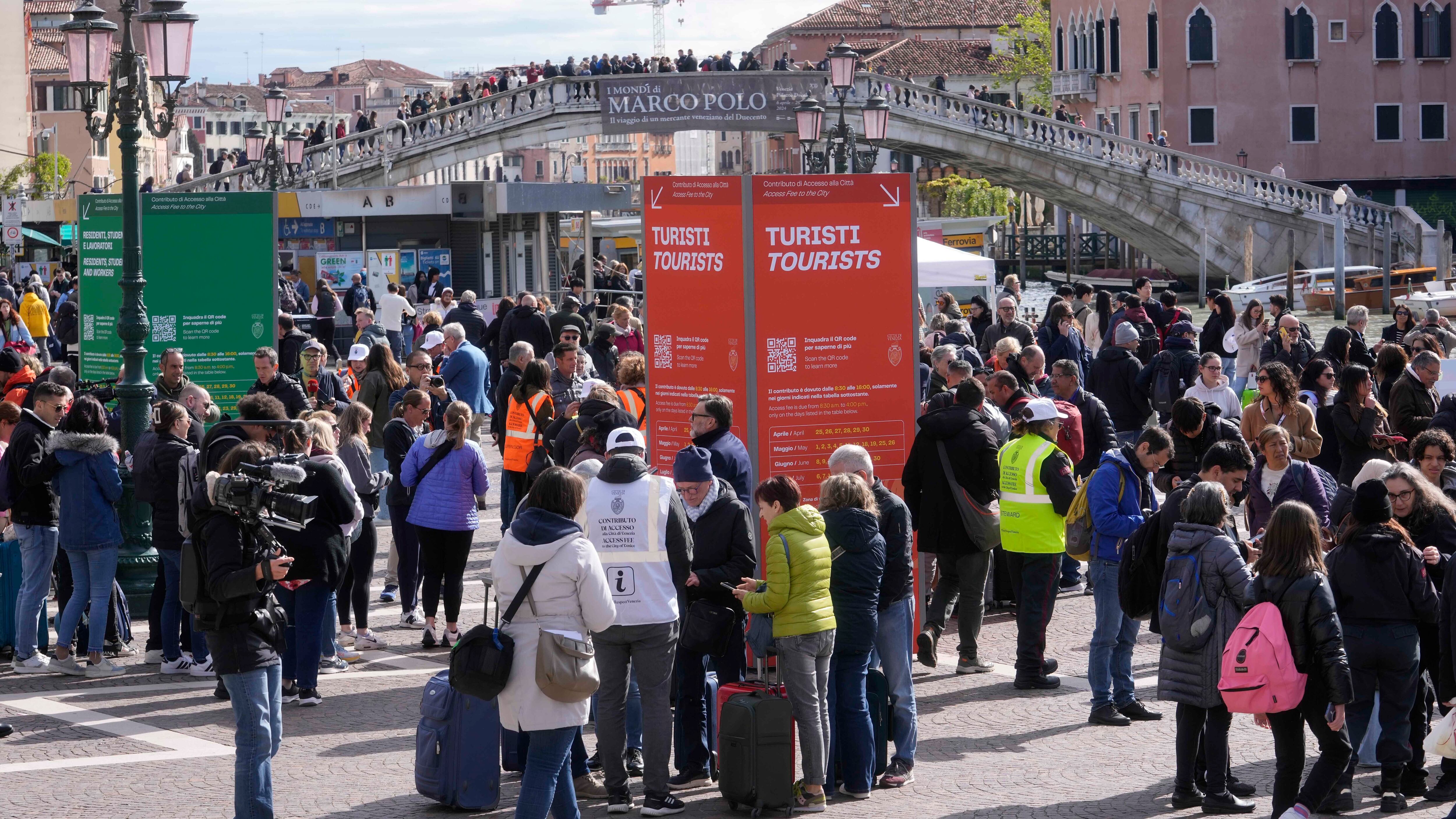 Los visitantes que llevaban a la principal estación de tren de Venecia eran recibidos con grandes carteles que enumeraban las 29 fechas de julio incluidas en la fase de pruebas del plan, así como nuevas filas de acceso que separaban a los turistas de residentes, estudiantes y trabajadores.