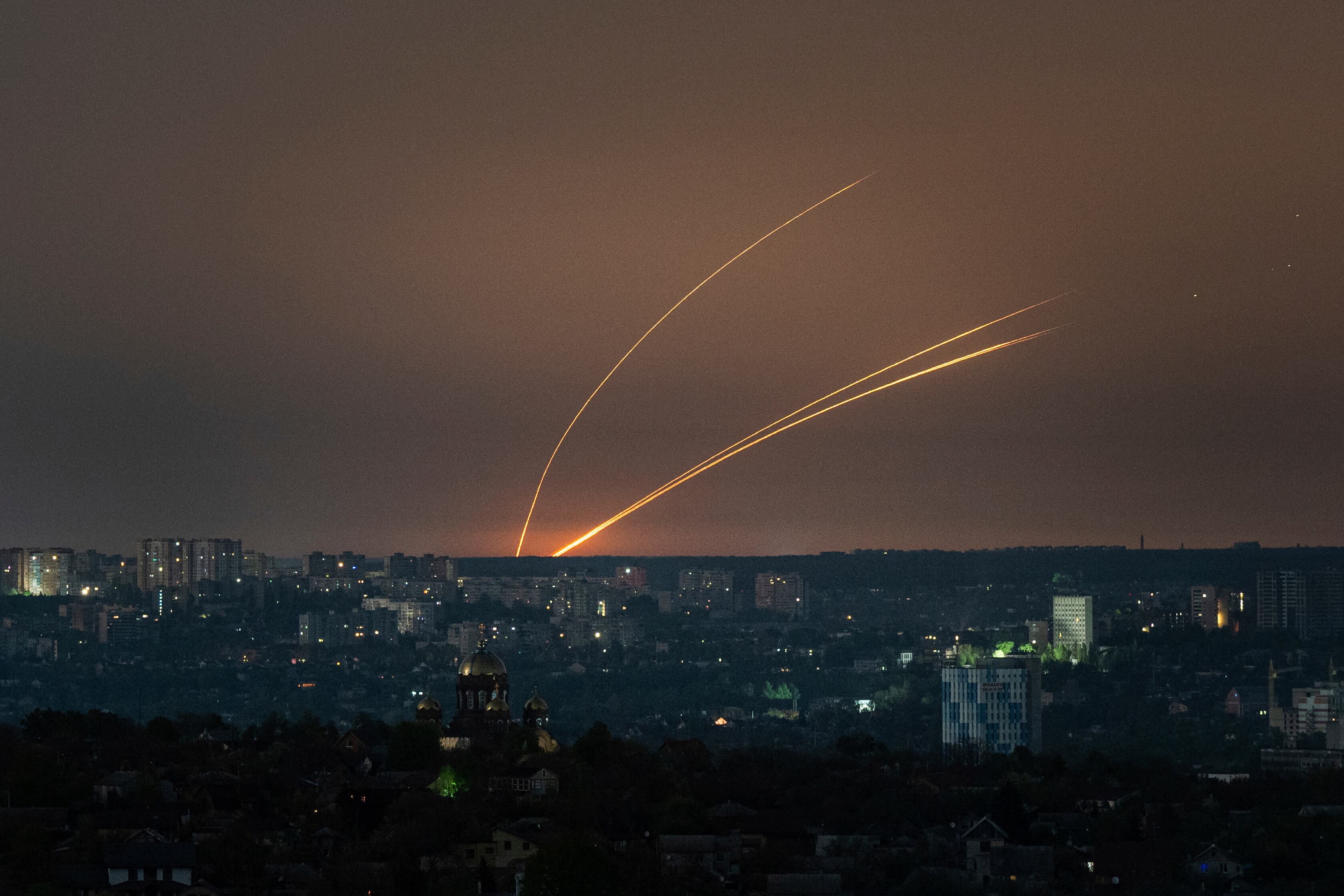 Cohetes rusos lanzados contra Ucrania desde la región rusa de Belgorod, vistos desde Járkiv, Ucrania, el jueves 18 de abril de 2024. (AP Foto/Evgeniy Maloletka) AP (Evgeniy Maloletka/AP)