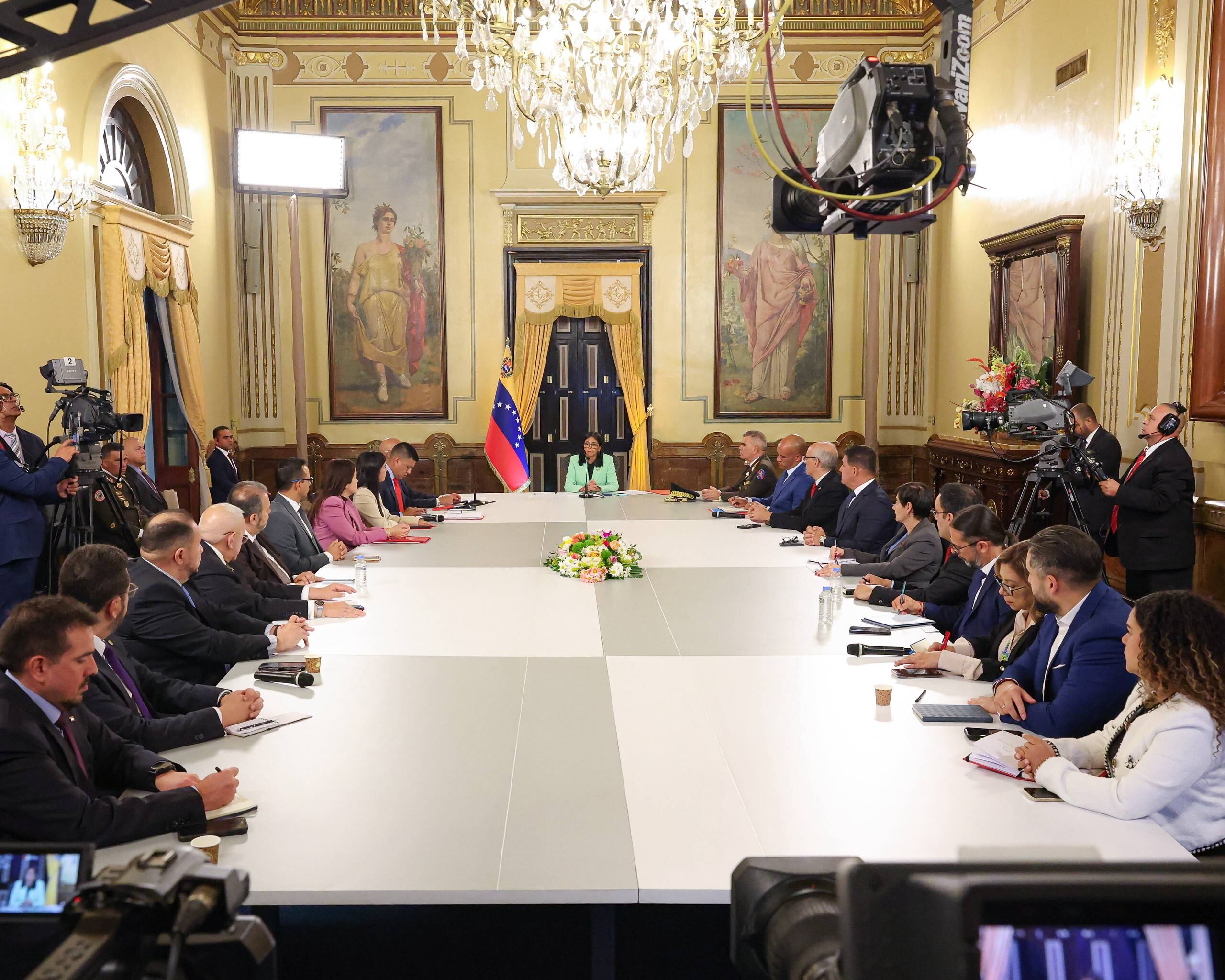 Reunión “Nuestras manos están tendidas, para todos los países del mundo, para relacionamiento, cooperación económica, comercial y energética”, dijo Delcy Rodríguez al afirmar que las relaciones económicas de Venezuela están diversificadas en distintos mercados en el mundo, como están diversificadas sus relaciones geopolíticas. Foto: Prensa Presidencial. (Prensa Presidencial)